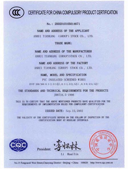 聚氯乙烯絕緣屏蔽電線被中國(guó)質(zhì)量認(rèn)證中心評(píng)為中國(guó)國(guó)家強(qiáng)制生產(chǎn)產(chǎn)品認(rèn)證證書英文版